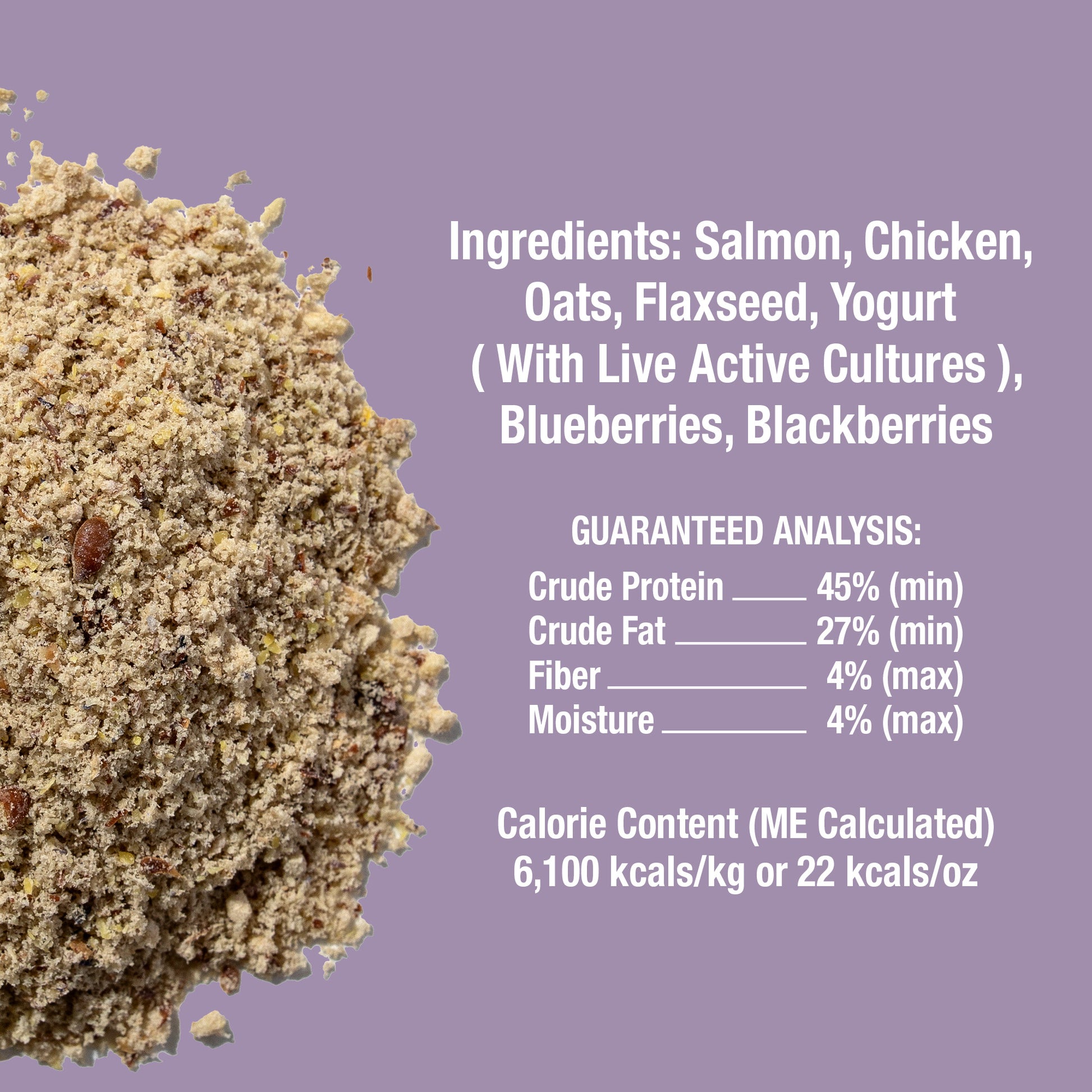 Crude Protein: 45% (min), Crude Fat: 27% (min), Fiber: 4% (max), Moisture: 4% (max). Calorie Content (ME Calculated) 6,100 kcals/kg or 173 kcals/oz.