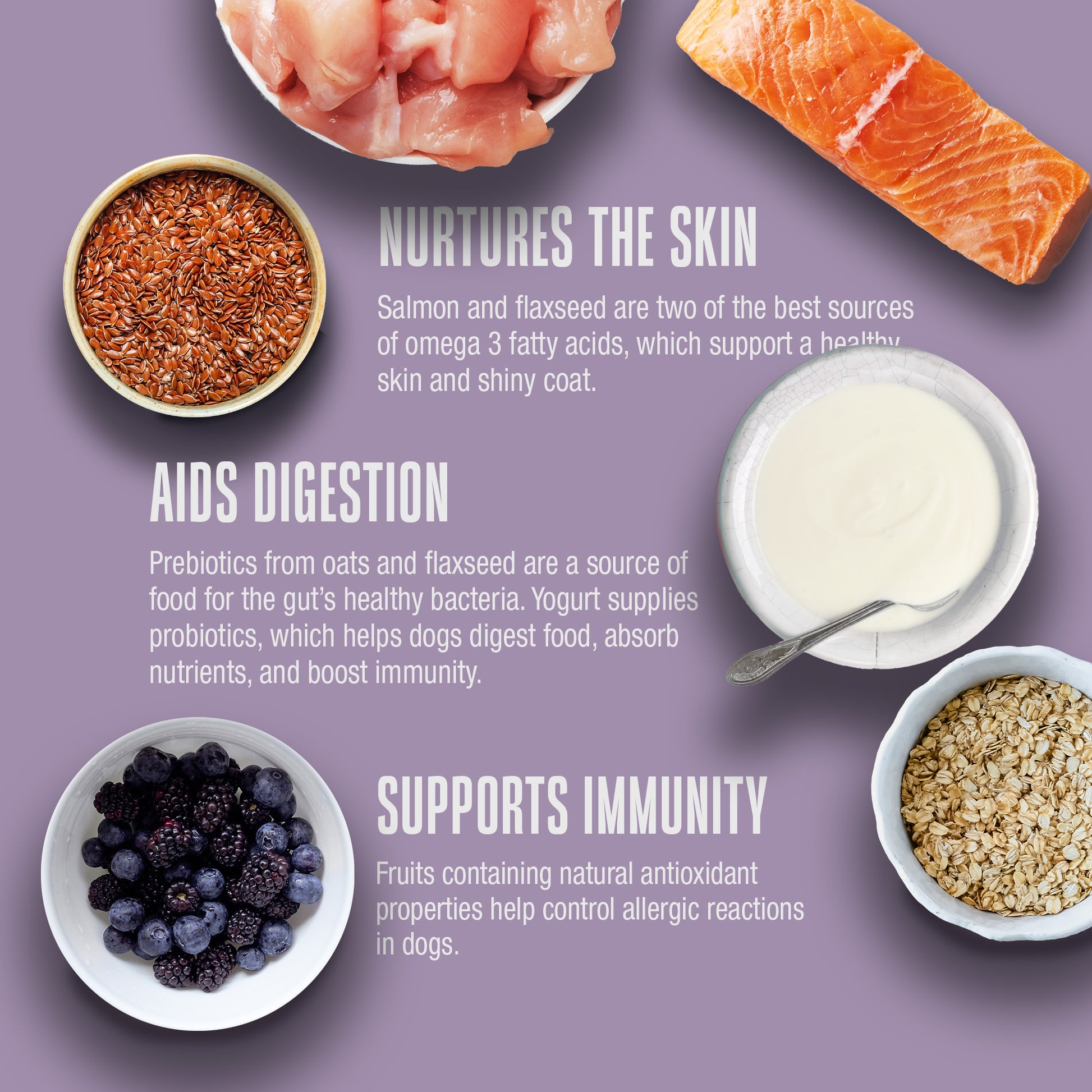 Salmon, Chicken, Oats, Flaxseed, Yogurt (Cultured Pasteurized Nonfat Milk, Cream, Live Active Cultures: Enterococcus Thermophilus, Lactobasillus Bulgaricus, Lactobasillus Acidophilus, Bifidobacterium Animalis, Lactobasillus Casei), Cranberries, Blueberries.