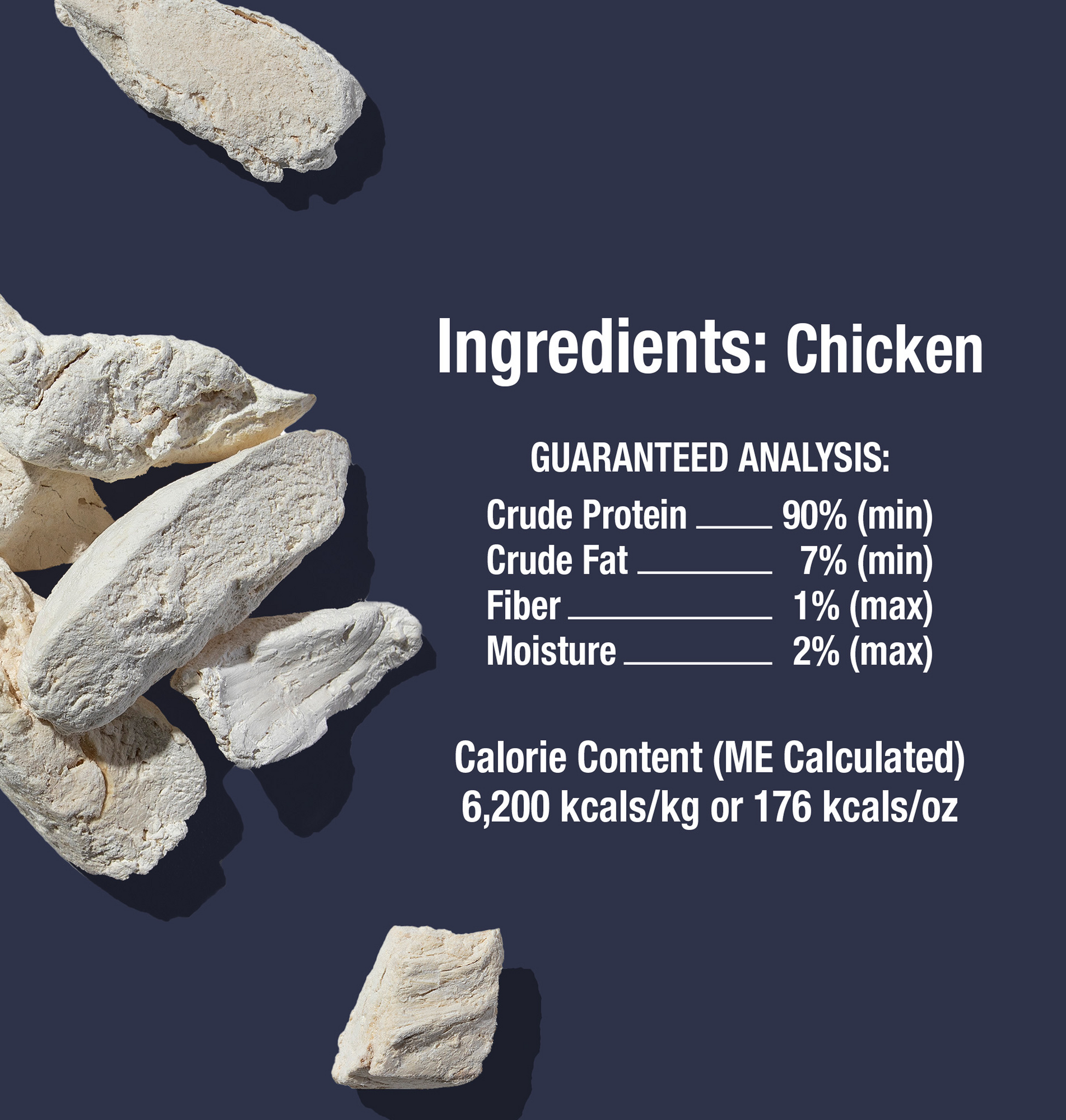 Single-ingredient protein-rich treats your pets crave. Our human-grade, USDA-approved chicken breast is freeze-dried fresh to lock in flavor and nutrients for a taste they’ll love.