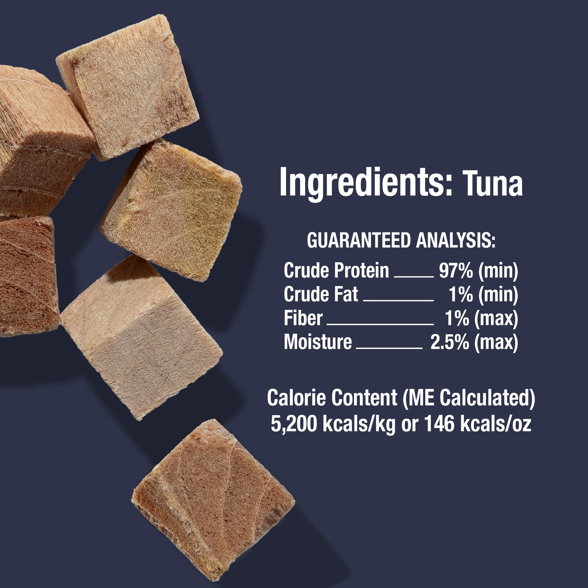 Single-ingredient protein-rich treats your cat craves. Our human-grade, wild-caught tuna is freeze-dried fresh to lock in flavor and nutrients for a taste they’ll love.